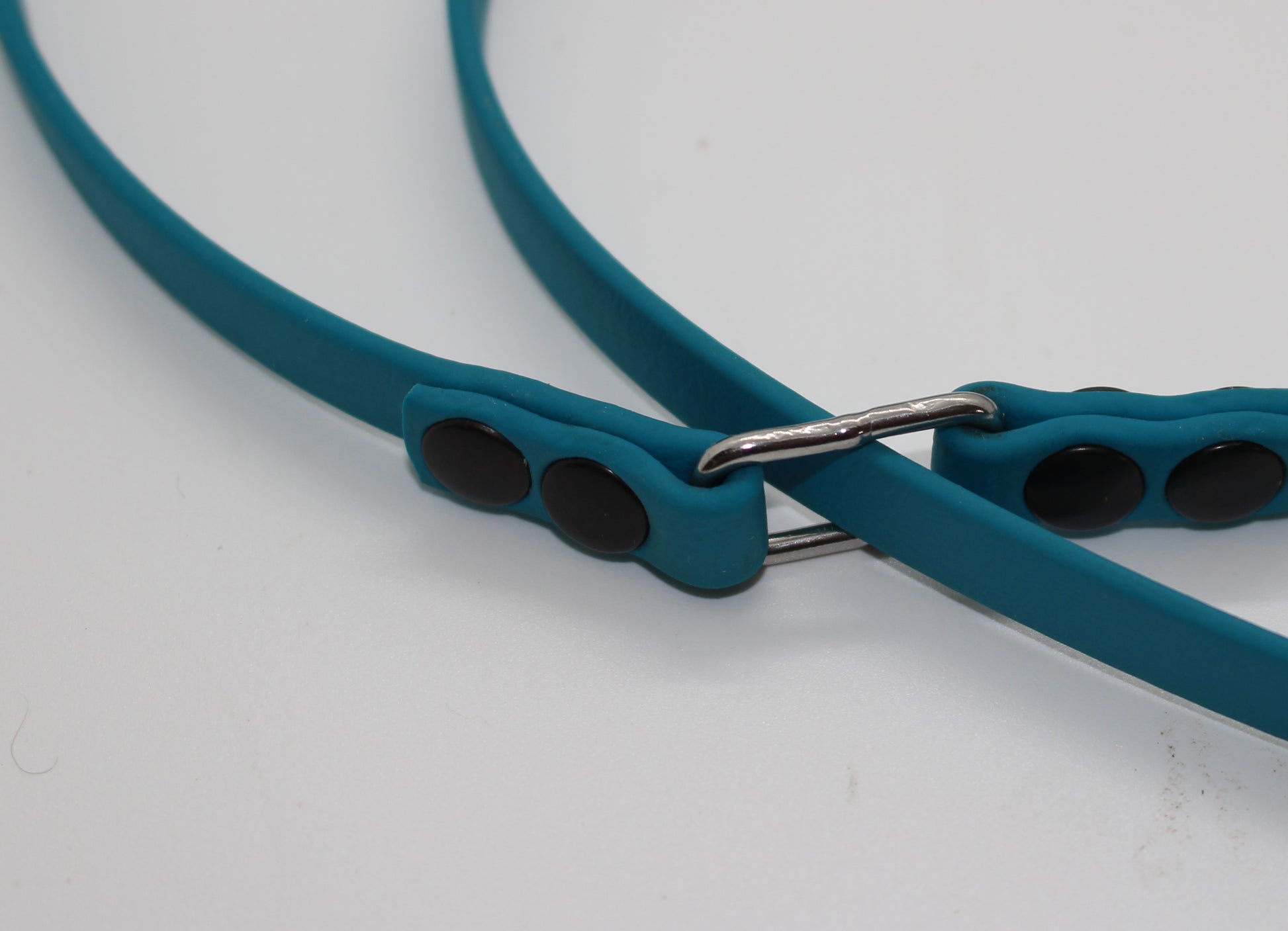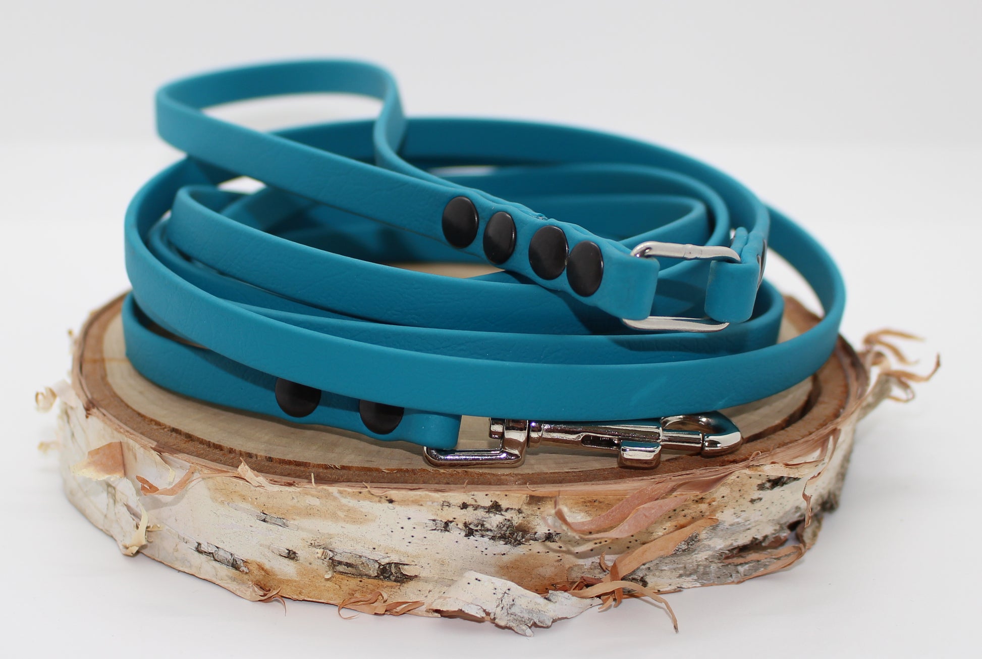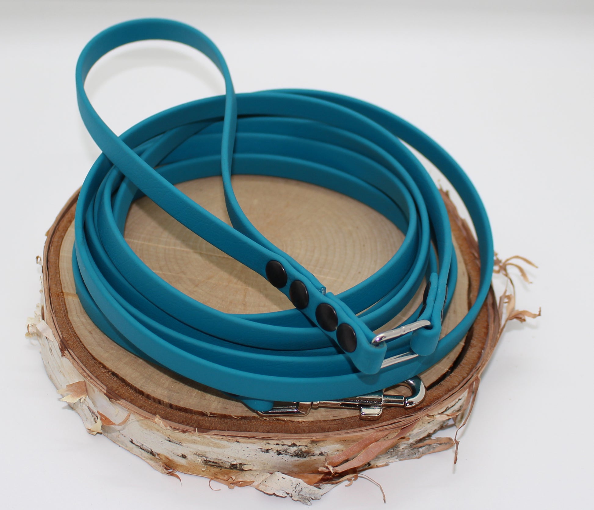 These long lines are made from 3/8" material, which keeps them lighter. They have a unique rectangle placed near the handle you can slip the clip through and place the long line over you shoulder or around you waste. Great tracking lines, doesn't matter if they get wet and they will not stink from getting wet, simply wipe away the water.
